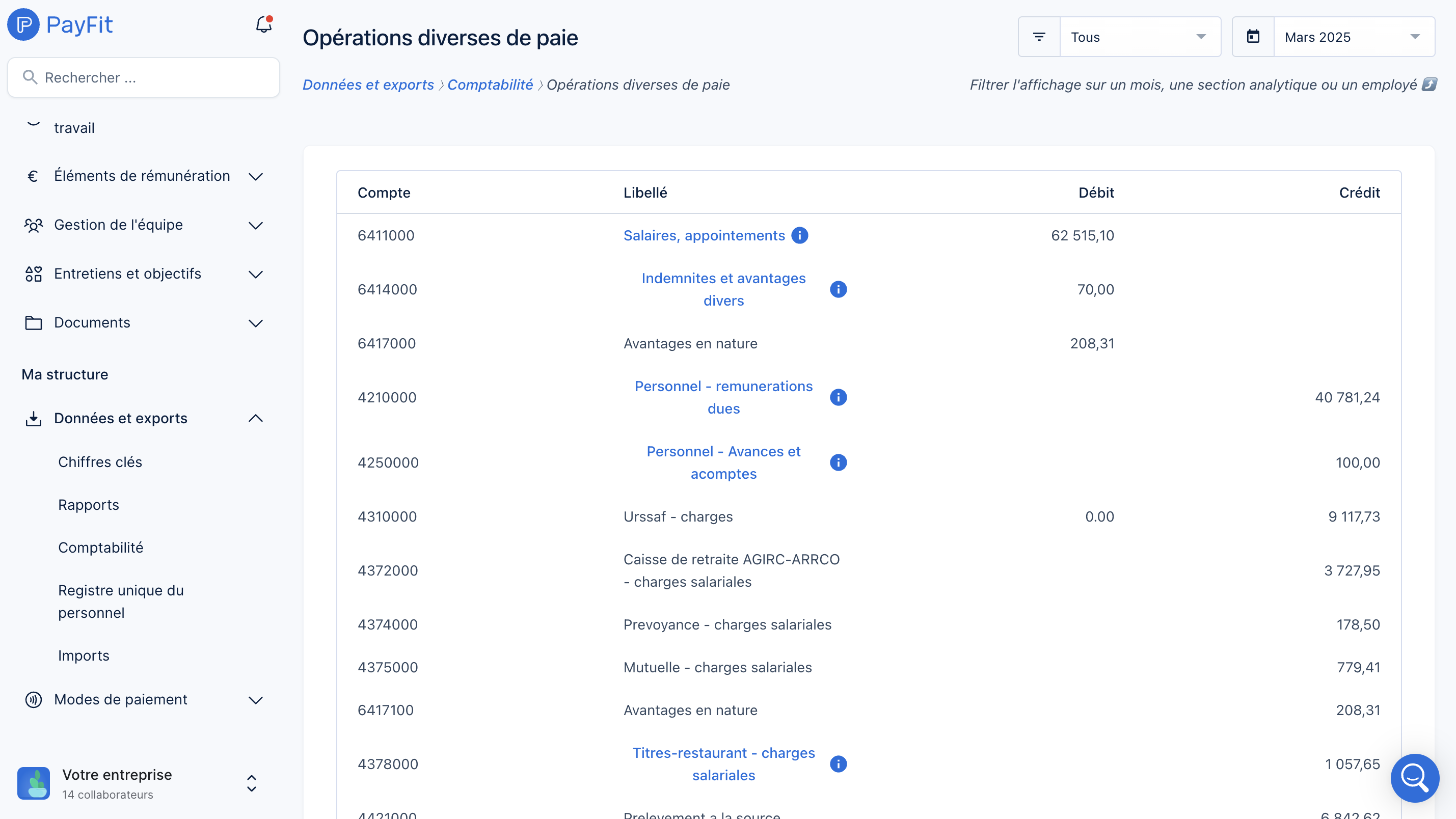 To learn more on payroll journal, have a look at our factsheet. The accounting export file can be customizable in the Accounting space of PayFit by the admin.